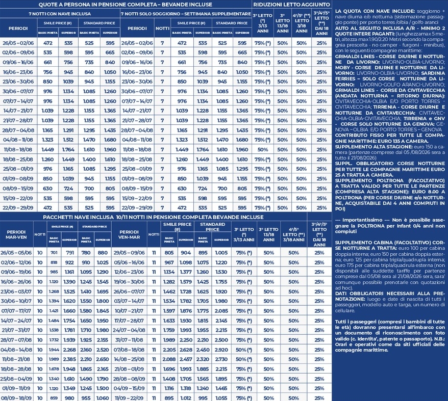 - SPECIALE ADULTO CON BAMBINO: un adulto con un bambino 3/18 anni in camera doppia pagano 1,75 quote in solo soggiorno, 1,80 quote con nave gratis;