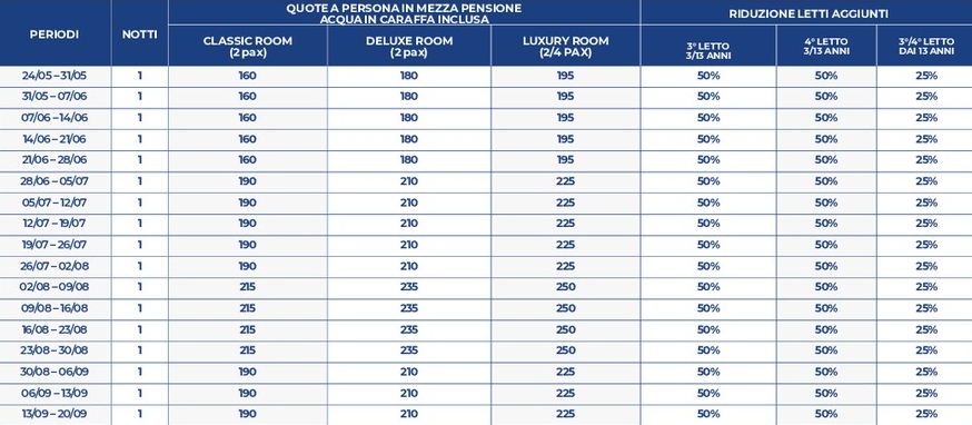 - LATE CHECK-OUT: entro le 16:00 euro 25 per persona in classic, deluxe e luxury (3°/4° letto free), euro 100 a persona in grand suite ed elegantsuite (3°/4° letto free);